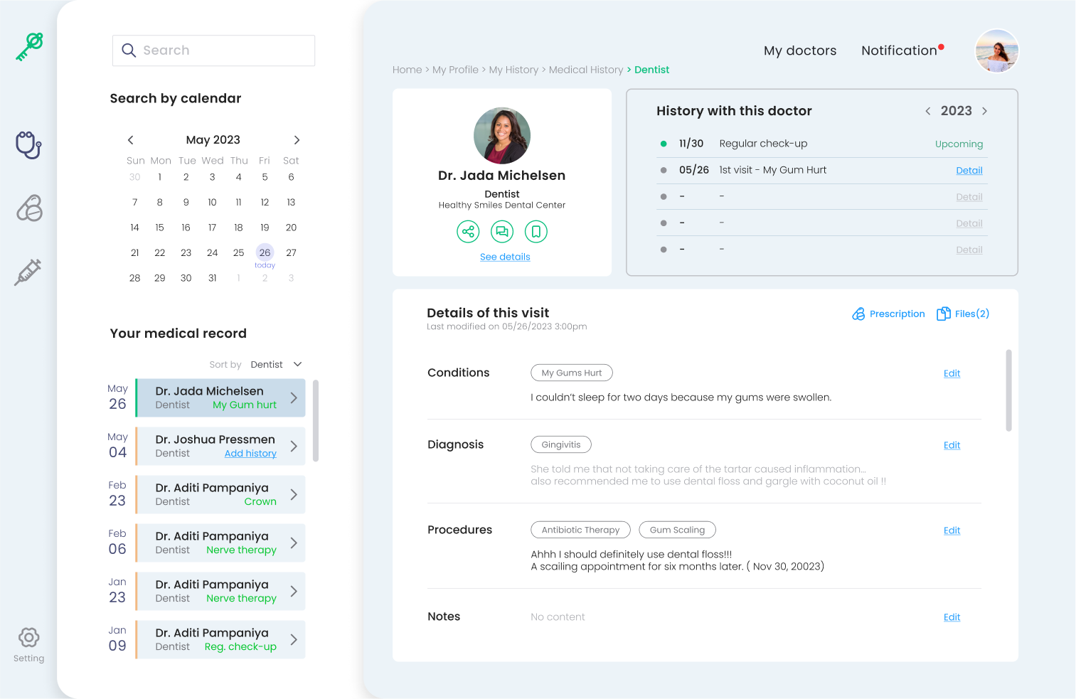 Right after a doctor’s visit, effortlessly log your health. And review all medical records in the ‘ My history’ section.