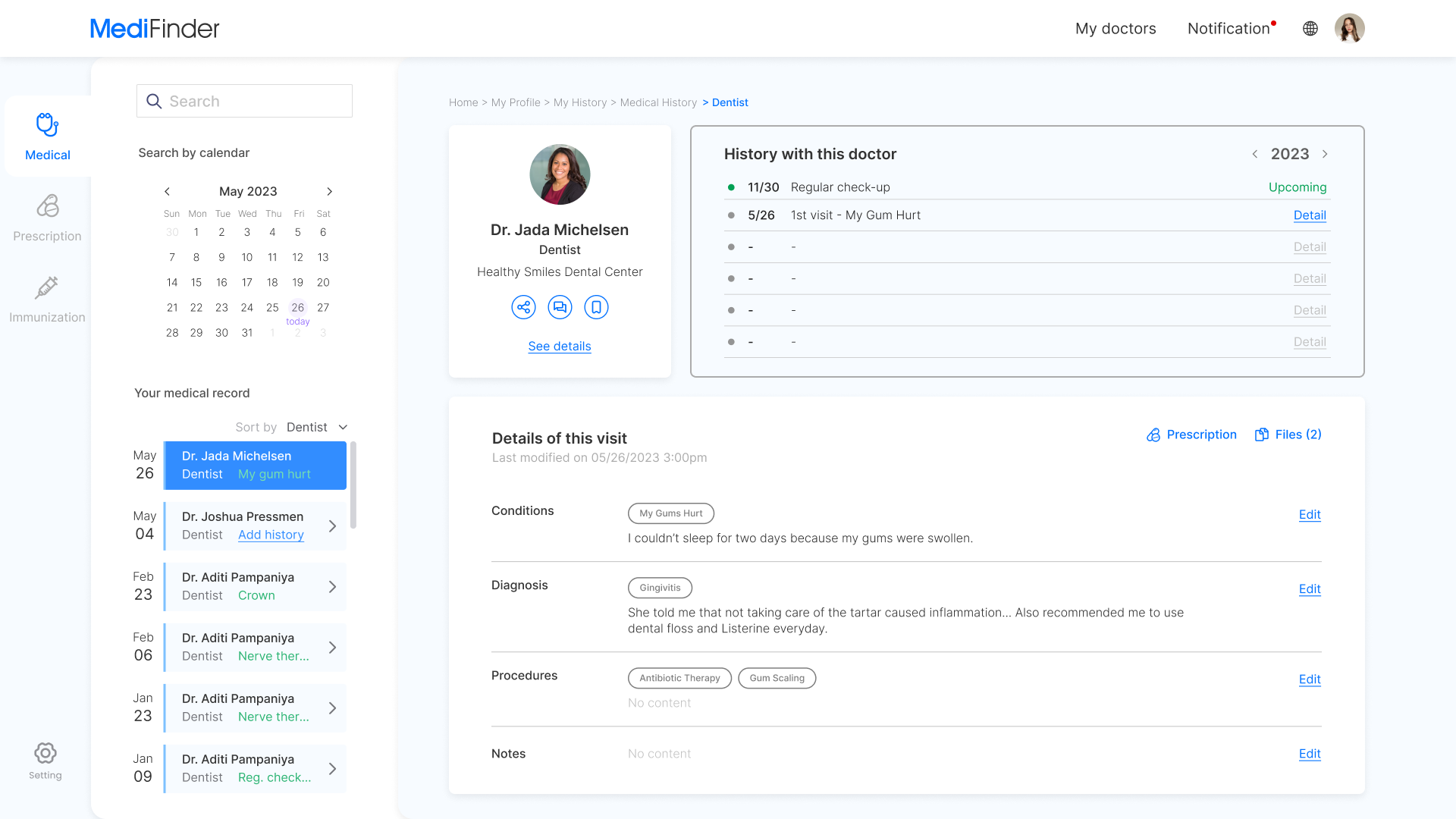 Tabs display Health record, Prescription history, Immunization record and Past appointment